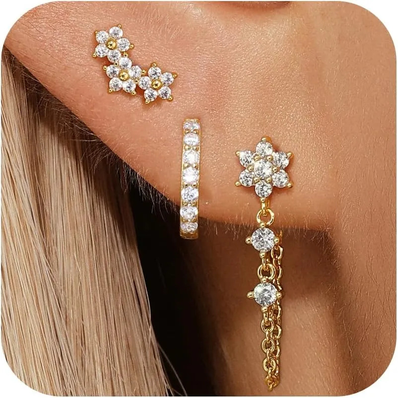 - Gold Flower Earring StacksPackage includes 3 pairs earrings, 3-flower studs, flower stud dangles, and huggie earrings. 3 pairs different styles can provide a variety of options for different occasions. These earrings are elegant and classic women men of all ages can wear them every day