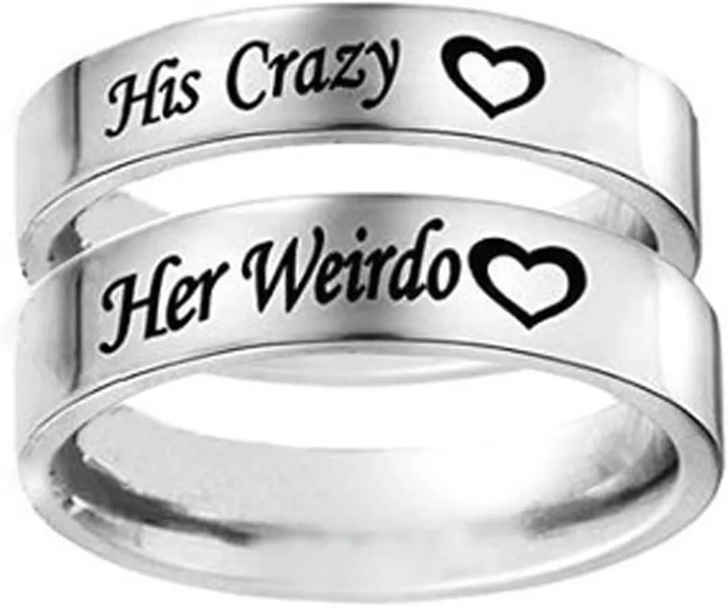2 PCS Stainless Steel Couple Rings with Engraving Her Weirdo His Crazy High Gloss Polished Width 6MM Silver Couple Rings Custom