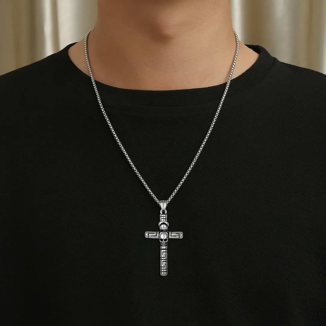 - STAINLESS STEELN - Crafted from high-quality stainless steel, this men's cross skull necklace guarantees long-lasting durability and a sleek.