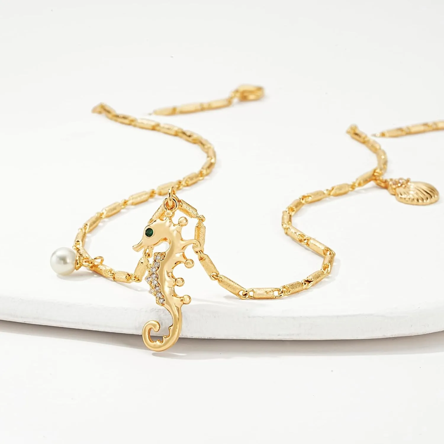 - Ocean-Inspired Design: This stunning gold necklace features a beautifully detailed seahorse pendant, accented with a lustrous pearl and a charming seashell, capturing the essence of the sea