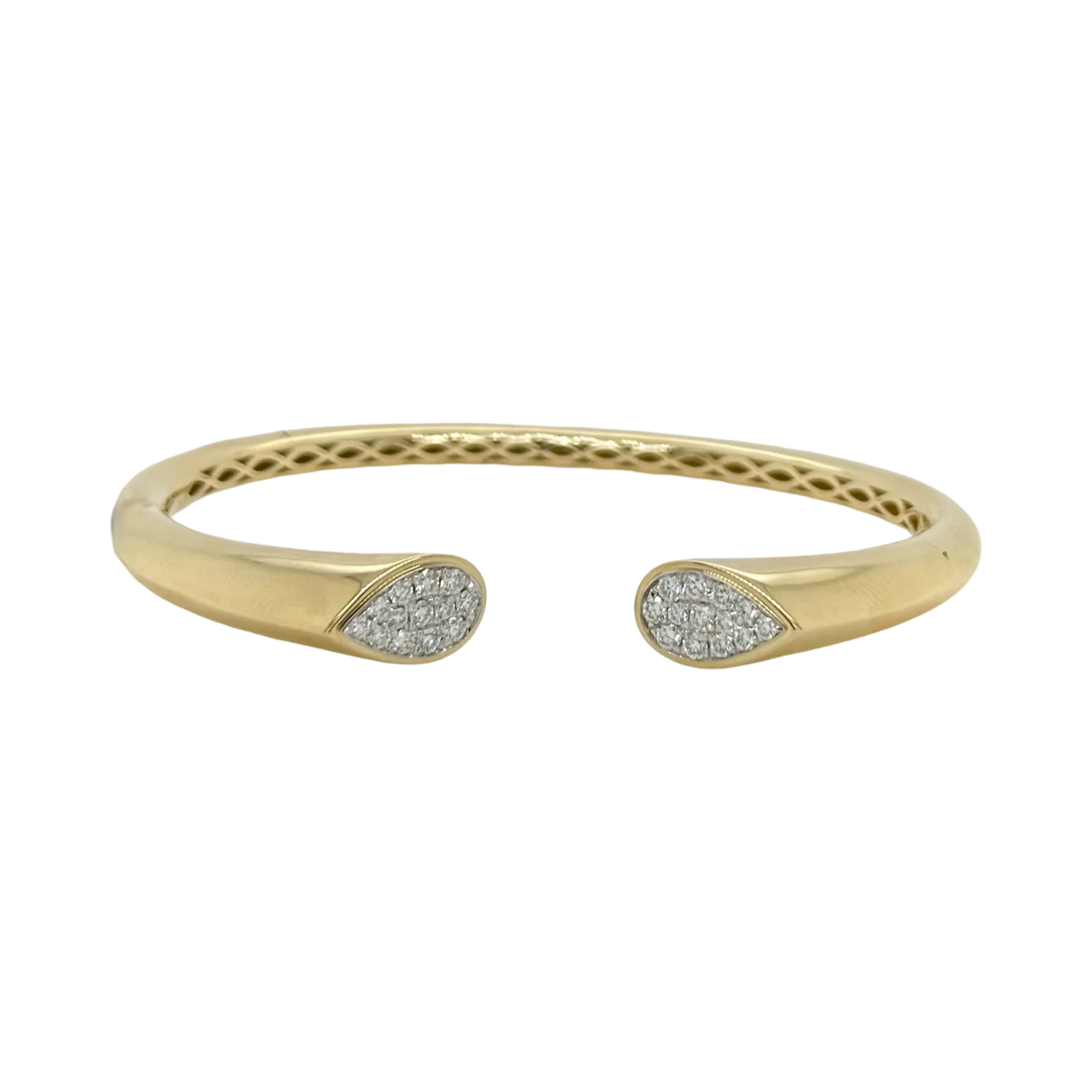 Slip your wrist into a dazzling embrace of sophistication with the open diamond edge bangle. This exquisite piece features a sleek, minimalist design that highlights the pure brilliance of its diamonds. The bangle's open-ended style creates a modern, fluid silhouette, while the diamond-studded edges catch and reflect light with every movement, creating a sparkling cascade of elegance. Perfect for layering or wearing alone, it effortlessly blends timeless luxury with contemporary charm, making it a versatile addition to any jewelry collection.