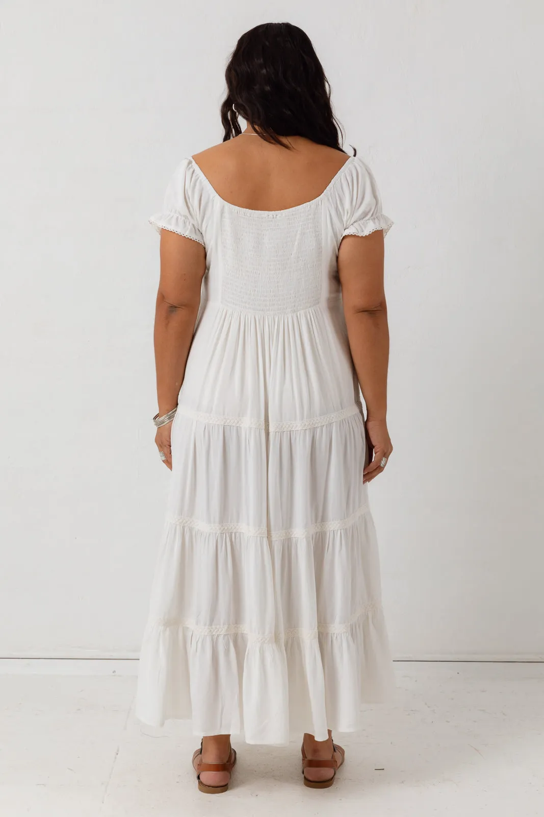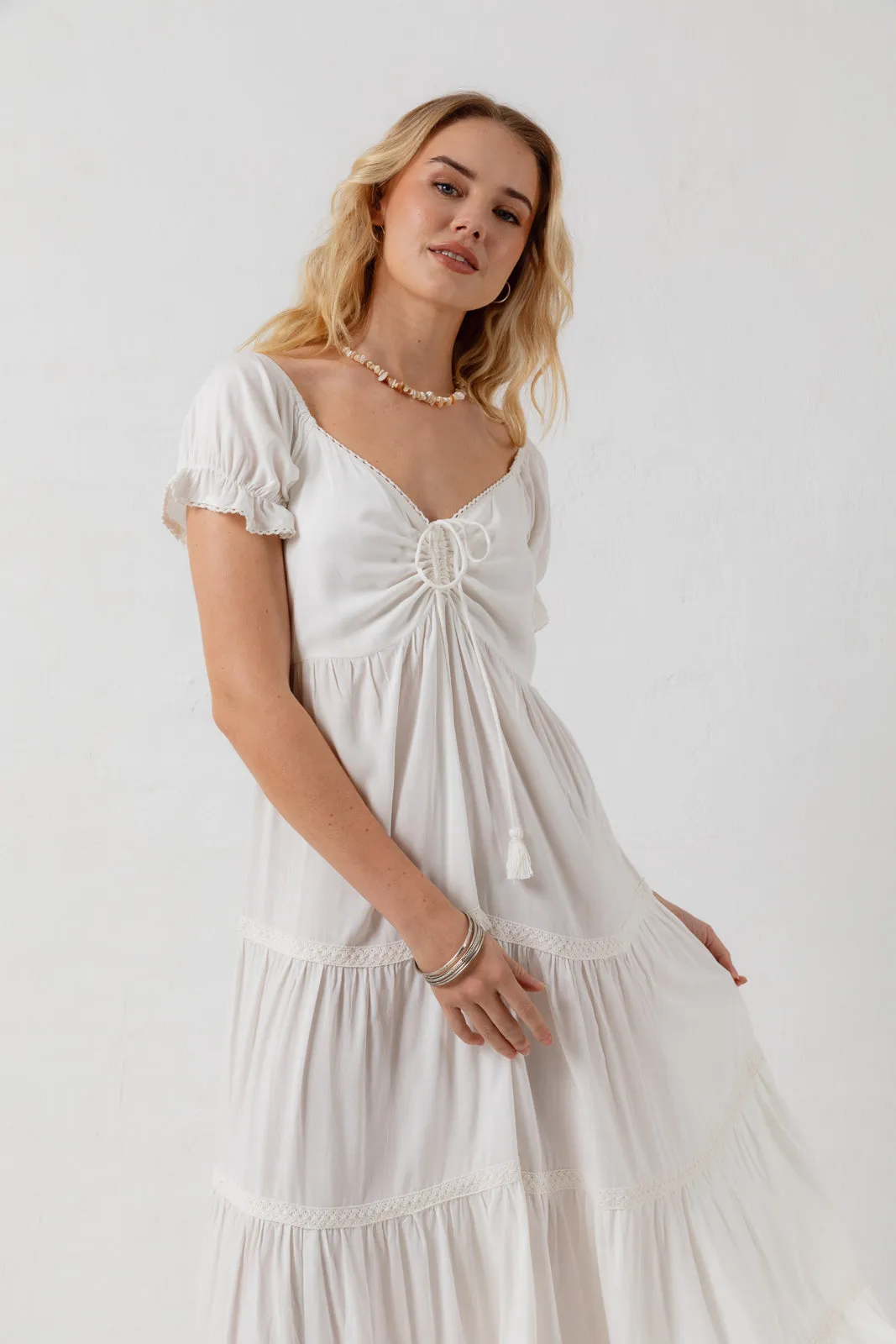 Our Sitara Dress is divinely feminine with adjustable tie detail, fairy tale puff sleeves, and a full-tiered skirt. She's a little bit sweet and a little bit vintage. We love pairing her with our favourite vintage tassel bag and stacks of silver bangles.