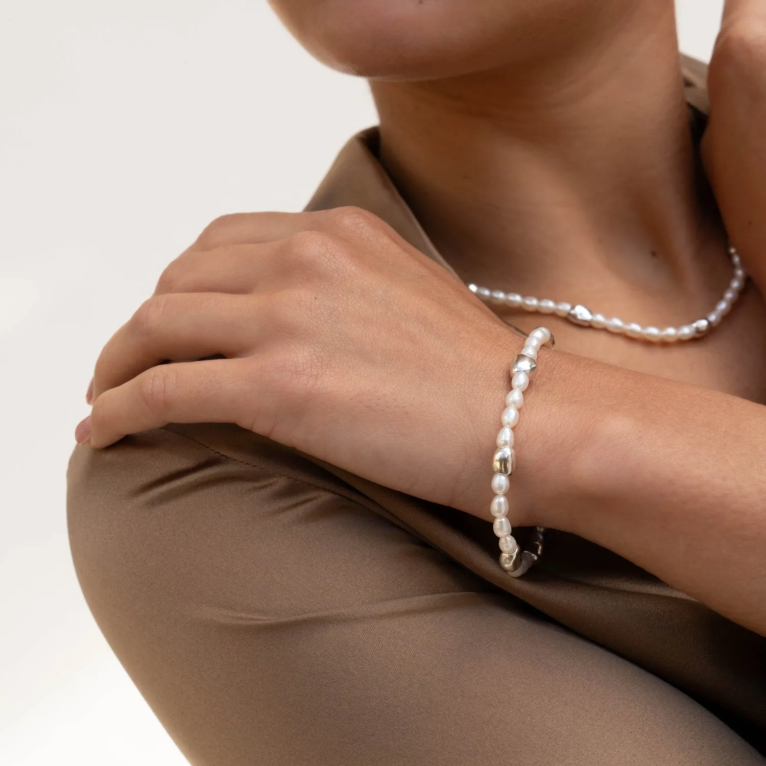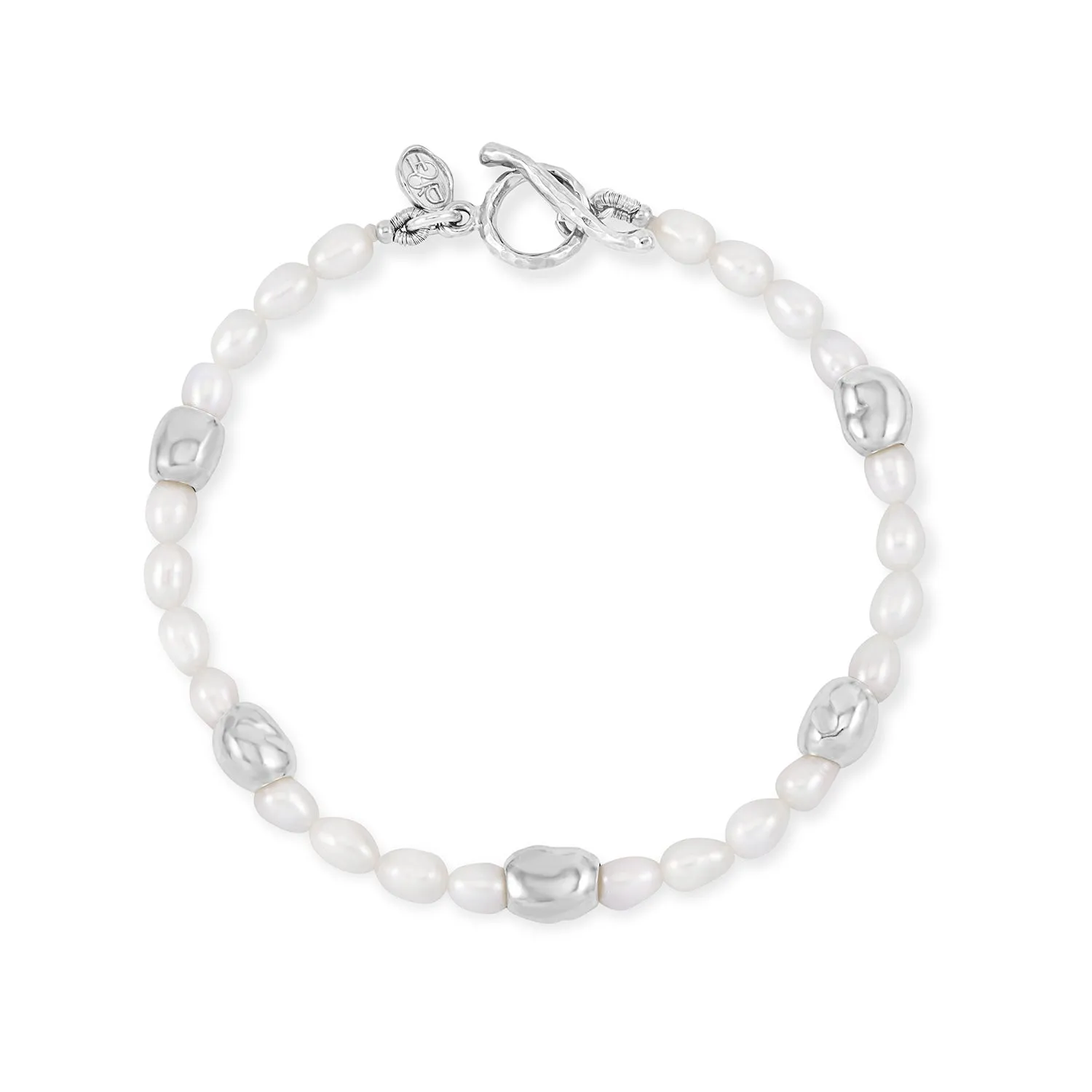 Thread by hand in our London studio, this lustrous pearl bracelet will slip seamlessly into your collection of style staples. The modern mix of oval white freshwater pearls and 5 shiny sterling silver ocean pebble beads makes it perfect for layering up with other bracelets. Complete with our signature sterling silver hammered circle and t-bar catch.